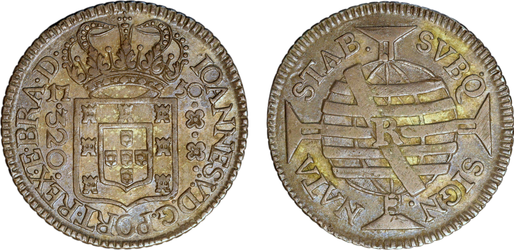 Coroa sobre escudo, data, valor 320 e 2 florões. Legenda: IOANNES • V • DG • PORT • REX • ET • BRAS • D •. Tradução: João V, pela graça de Deus, Rei de Portugal e Senhor do Brasil. 1750 Diversas Legendas BRA·D e BRAS·D. | Esfera armilar e Ordem de Cristo e Letra R. Legenda: SVBQ SIGN NATA STAB. Tradução: Sob este sinal nasceu e permanecerás.