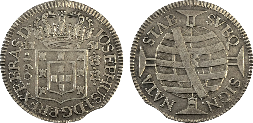 Coroa sobre escudo, data, valor 160 e 2 florões. Legenda: JOSEPHUS · I · D · G · P · REX · E · BRAS · D. Tradução: José I, pela graça de Deus, Rei de Portugal e Senhor do Brasil. | Esfera armilar e Ordem de Cristo e Letra R. Legenda: SVBQ SIGN NATA STAB. Tradução: Sob este sinal nasceu e permanecerás.