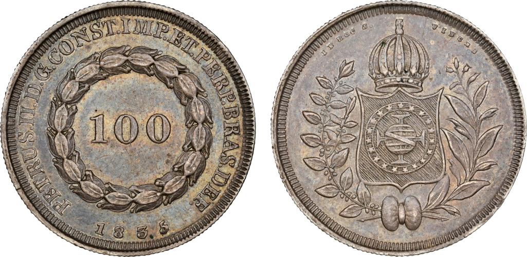 Valor 100 dentro de grinalda de tulipas, data embaixo. Legenda: PETRUS · II · D · G · CONST · IMP · ET · PERP · BRAS · DEF. Tradução: D. Pedro I, pela graça de Deus, Imperador Constitucional e Defensor Perpétuo do Brasil | Escudo coroado sobre ramos de café e tabaco. Legenda: IN HOC S. VINCES. Tradução: Com este sinal vencerás.