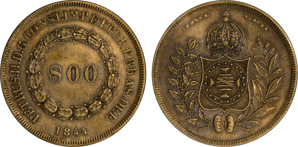 Valor 800 dentro de grinalda de tulipas, data embaixo. Legenda: PETRUS · II · D · G · CONST · IMP · ET · PERP · BRAS · DEF. Tradução: D. Pedro I, pela graça de Deus, Imperador Constitucional e Defensor Perpétuo do Brasil | Escudo coroado sobre ramos de café e tabaco. Legenda: IN HOC S. VINCES. Tradução: Com este sinal vencerás.