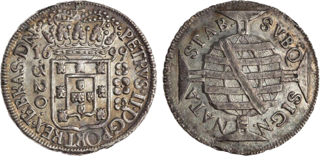 Coroa sobre escudo, data, valor 320 e 3 florões. Legenda: PETRVS • II • DG • PORT • REX • E • BRAS • DN •. Tradução: Pedro II, pela graça de Deus, Rei de Portugal e Senhor do Brasil. | Esfera armilar e Ordem de Cristo. Legenda: SVBQ SIGN NATA STAB. Tradução: Sob este sinal nasceu e permanecerás.